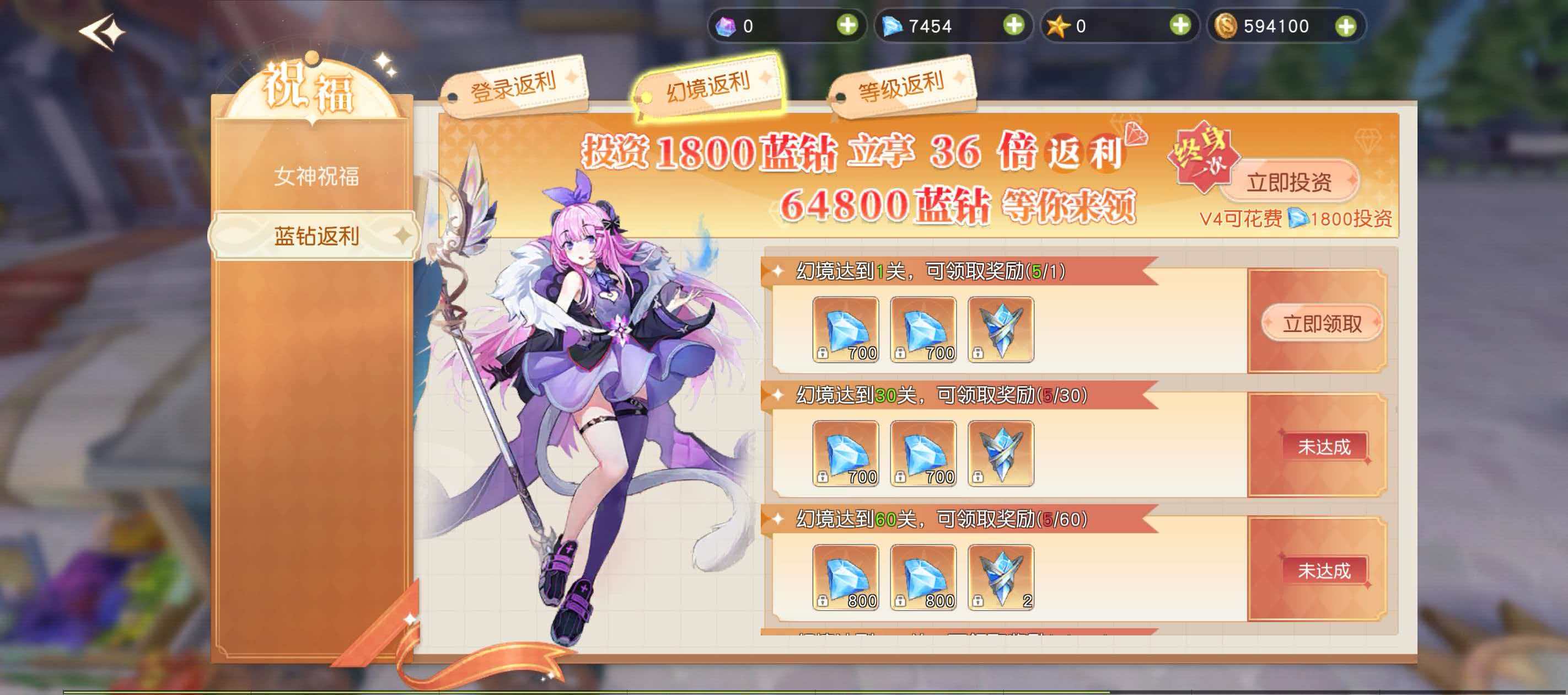在看了解女神祝福这个玩法以后,小编在给大家介绍一下女神祝福下面的蓝钻返利内容,蓝钻返利玩法需要玩家先进行投资才行,在蓝钻返利中一共有登录返利、幻境返利和等级返利三个内容,登录翻录就只要玩家投资600个钻石,就能够享受到15倍的高额返利哦,能一共领取的9000蓝钻,不过需要玩家通过累积登录的方式来领取,幻境返利需要vip等级到了4以后以后才能投资,投资1800个蓝钻可以享受36倍的返利,一共可以领取64800个蓝钻,以幻境闯关的方式来领取,玩家闯幻境,只要到领取的关卡限制就能拿到返利,等级返利则是一个玩家只能享受到一次的终极返利投资,玩家只要花费3000个钻石就能够享受120倍的终极返利,能够获取的蓝钻数量足足高达36000个。