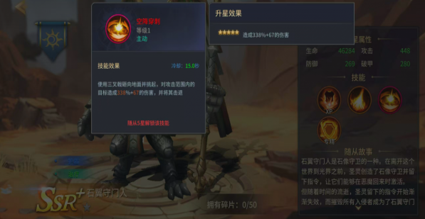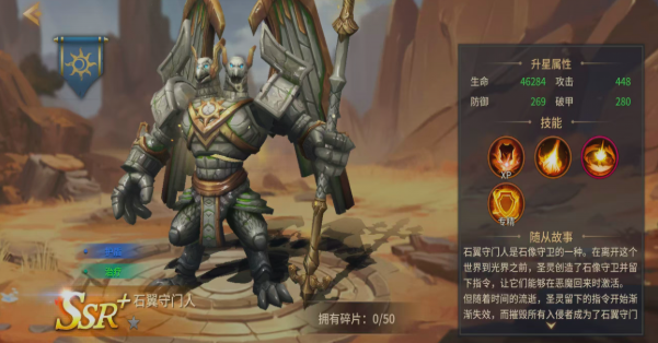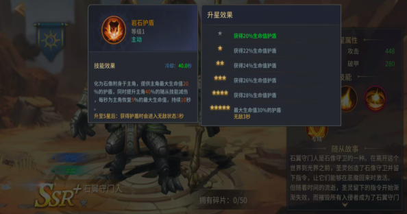 作为石像守卫的进阶形态,他自带SSR专属加成,主动触发就可以给主角叠8%的全伤害减免,单纯性就这一点,就会提升队伍在高难度战斗中的容错率。他的技能组更是把治疗输出还有防护结合在一起。第1个技能打基础伤害的同时,还会有20%的概率给主角套上一个护盾,可以吸收主角最大生命值5%的伤害。在打小怪时,慢慢的积攒生存优势即可,第2个技能空降穿刺就是一个比较实用性的范围技能。可以把敌人打退,在关键的时刻还可以拉开身位去躲技能。