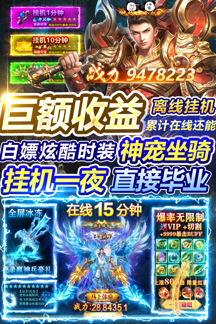 2月刚上线的一个传奇类手游,属于超变无限刀传奇类型,以一秒十刀、刀刀切割的战斗模式吸引玩家,游戏采用单职业设定,万倍爆率加成,装备可全图自由掉落,打怪效率高,装备掉落频繁,再加上满屏光柱特效,战斗体验十分畅爽。而且游戏复刻了经典传奇中的沙城攻防战和跨服竞技,也支持野外自由PK。