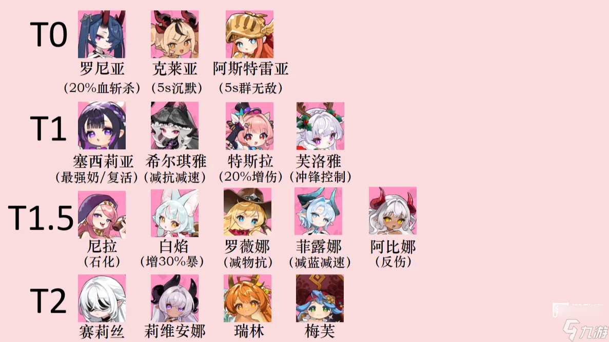 1、TO(必养):罗尼亚{高伤+低于20%血斩杀}、克莱亚{高伤+5s沉默}、阿斯特雷亚{5s无敌}。