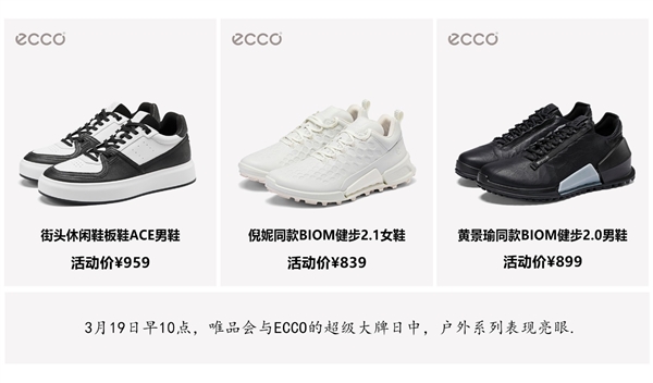 但显然,运动户外庞大的消费市场与节节攀升的增速也吸引着这家鞋履巨头:3月19日,在ECCO与特卖电商唯品会联合举办的超级大牌日中,其极具运动户外风格的BOIM系列鞋款成为关注度最高的产品之一,黄景瑜同款的BOIM健步2.0款男鞋、倪妮同款的BOIM健步2.1款女鞋价格甚至分别低至899、839元,相比市场上的低价,还剧降了500至1500元。