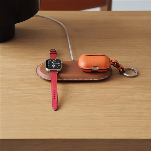 该产品整体由爱马仕标志性的“金色Swift小牛皮”精心包裹,触感细腻且极具辨识度,可以同时给iPhone和Apple Watch充电。