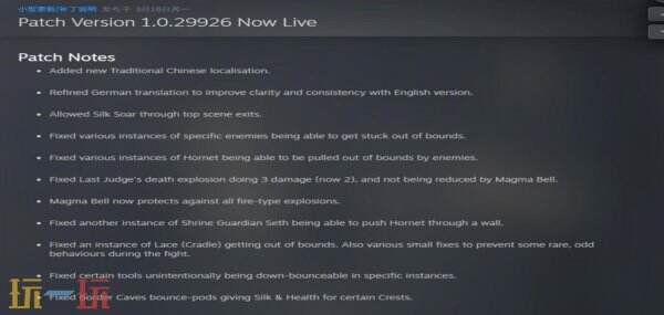 Team Cherry 近日推送《空洞骑士:丝之歌》1.0.29926 版本,官方明确这是2026悲恸之海(Sea of Sorrows)扩展包上线前的最后一次重大更新。本次更新 PC 端已实装,繁体中文登场,主机版即将推送。