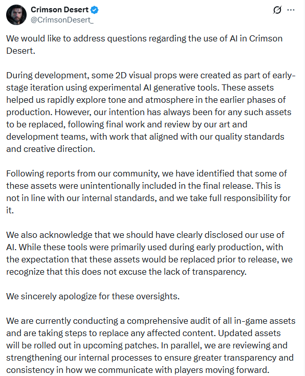 近日,动作角色扮演游戏《红色沙漠》的开发商Pearl Abyss在社交媒体发布官方声明,回应了玩家社区对于游戏中出现生成式AI痕迹的担忧。