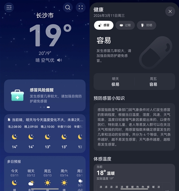 华为天气首页的“智能卡”也是保姆级护航。前两天打开App收到“感冒风险提醒”,我赶紧在群里分享,提醒朋友们外出加强防护,将贴心人设贯彻到底。