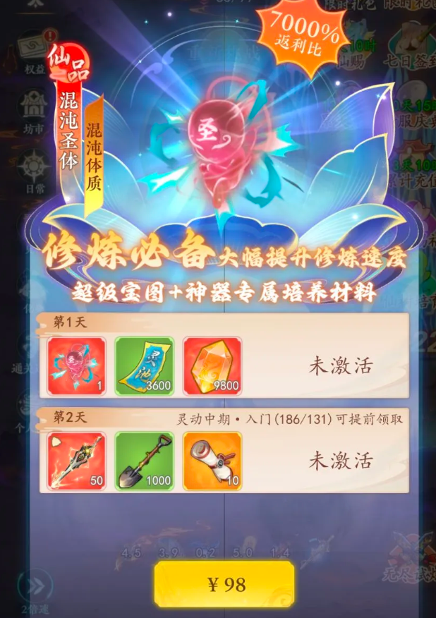这里也很推荐大家在游戏内完成首充就能获得一只天品级别的白虎,它算是前期里特别强力的宠物了能大幅度增加体质并协助大家战斗!如果还想要获得强力神器那就得解锁98元档位的混沌圣体神器,不仅可以帮助大家快速修炼还能获得超级宝图和神器专属的培养材料,可以减少前期的肝号时间将所有心思都放在破镜和做任务上面,就不需要花费时间去跑图开宝箱可一步到位!