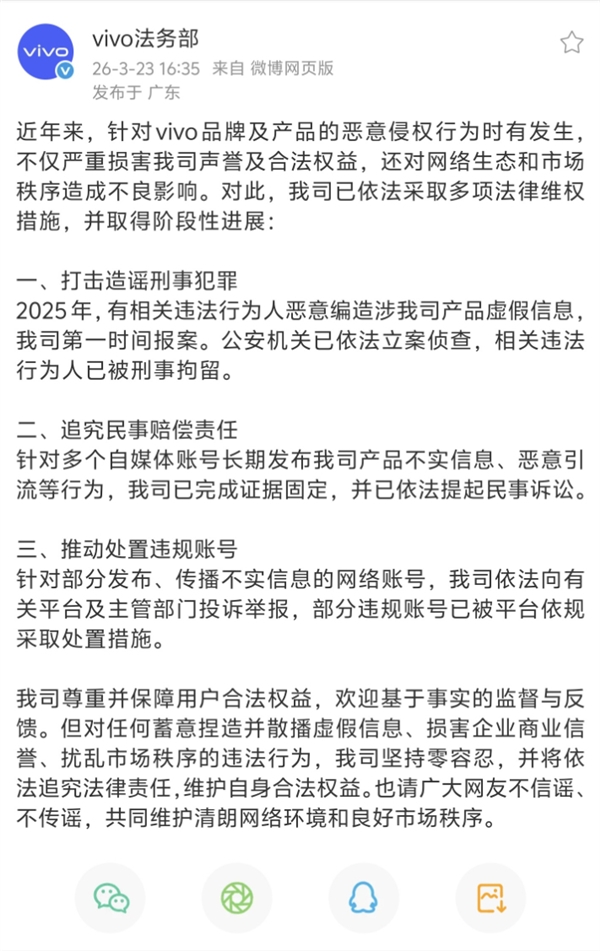 vivo法务部强调,我司尊重并保障用户合法权益,欢迎基于事实的监督与反馈。但对任何蓄意捏造并散播虚假信息、损害企业商业信誉、扰乱市场秩序的违法行为,我司坚持零容忍,并将依法追究法律责任,维护自身合法权益。也请广大网友不信谣、不传谣,共同维护清朗网络环境和良好市场秩序。