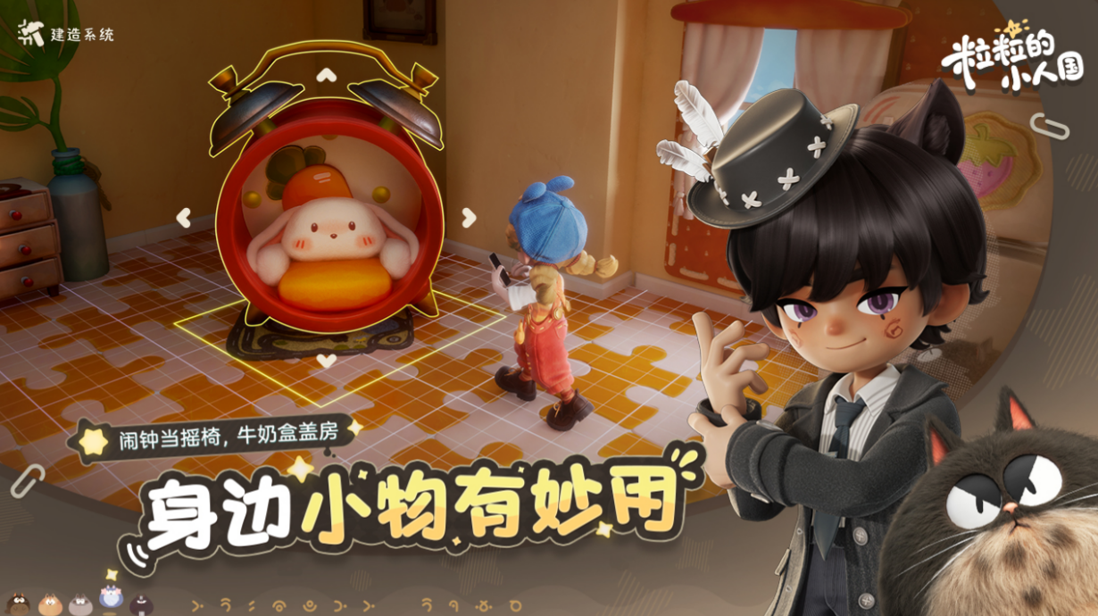 说完价格,再聊聊这游戏本身。粒粒的小人国的核心玩法是”变小“——玩家会变成小人,在书桌这种日常环境里生活。这个设定听起来简单,但实际体验起来会觉得挺新鲜。一张普通的书桌,在小人视角下就变成了一片很大的区域,键盘、耳机、存钱罐,这些日常用品全都变成了可以互动的场景道具。玩家可以利用非常多的材料,搭建一个自己的大房子,甚至还可以创建一个积木城堡,想要做迷宫也不是不可以。