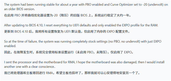 该用户表示从未进行过手动超频,仅开启了EXPO内存预设,目前CPU和主板已送修RMA。