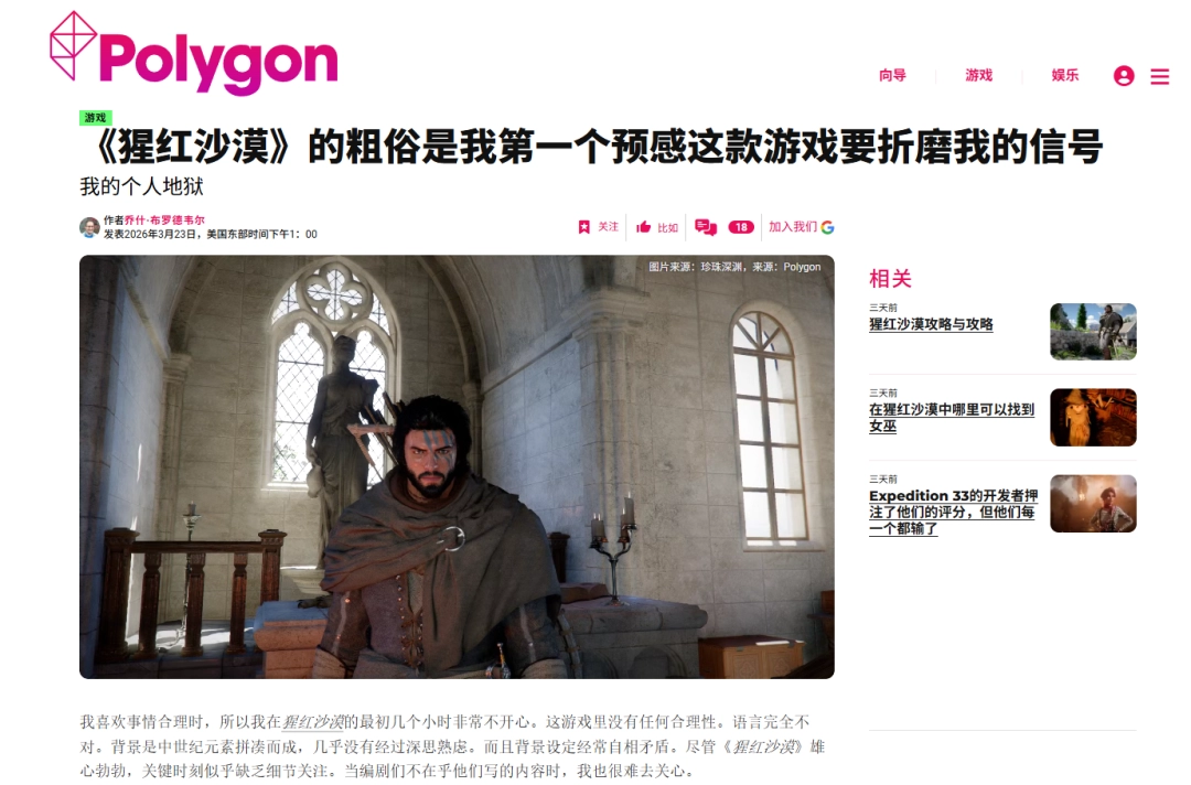 西方游戏门户网站Polygon近日发布评论文章,对韩国开发商Pearl Abyss出品的奇幻动作游戏《红色沙漠》提出批评。文章指出,游戏在台词设计方面存在明显问题,脏话用词与游戏所设定的中世纪背景严重不符,被形容为“有悖常识,令人不适”。