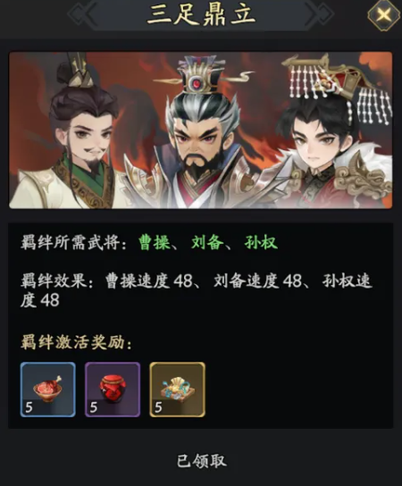 这里造成的能力当中,有机会可以让对面的怒气减少掉,他在回复了我方生命之后,还有一定的概率可以在净化负面效果之后,额外恢复我方队友身上的生命数值,所以在使用的情况下他使用的各方面能力也是有足够多的加成,包括三国鼎立羁绊这里速度都增加了48之后,大家可以看到其中羁绊激活了以后的奖励可以直接领取,这几个角色放在一起用的话,大家就可以保证整体阵容里面谋士队的组成成功了。