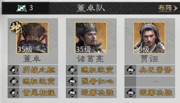 混乱永动队当中大家可以用的成员就是贾诩、诸葛亮、董卓,他们目前在经过一系列的调整之后,仍然有非常强的控制能力,而且整体阵容相对其他核心类型武将来说,进行定向抽取的话还是比较容易获取的,在3个武将都获取了之后,大家就要注意给他们进行阵容站位的时候,贾诩这里不用占追击的格子的效果,但是董卓是一定要战的,他一定要放在贾诩追击格子上面才可以触发自身能力,而且诸葛亮在这里同样是要跟董卓进行互站,这样的话,追击格子才可以为大家带来足够的强度加成,董卓下方的话,大家可以安放西凉铁骑,而诸葛亮跟贾诩后面的话,大家都可以放五斗米祭,这样搭配整体阵容成功之后,其中的董卓他的能力叫做独断专权,只要使用的话,就可以让我方全体角色的统率都夺取过去,然后随机给对方3名目标带来挑衅的功能,同时对这些目标施加异常状态的时候,我方后续的输出是会更加容易一些的。