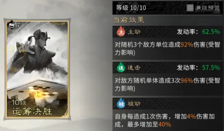 而诸葛亮的话这里带了通权达变之后,他的牵制效果主要是也要触发贾诩的控制被动技能,所以可以带的是运筹决胜,这个技能目前受到一次伤害的时候,就会带来4%的伤害提升,所以后期叠加到40%的时候,有10层诸葛亮此时的攻击特性就会非常高,而目前大家如果玩儿这个阵容的话,他凭借多重的控制以及混乱,其实造成的这个机制还是非常强大的。