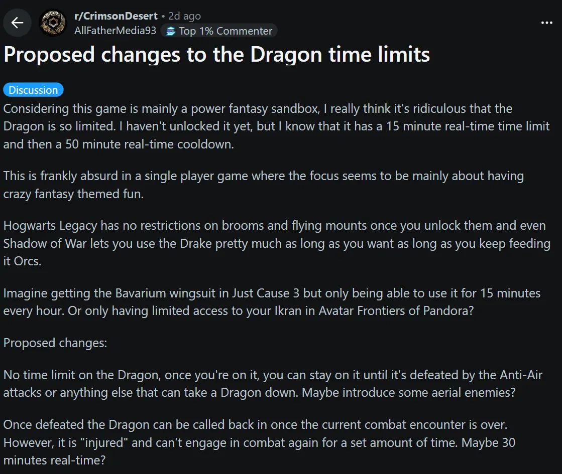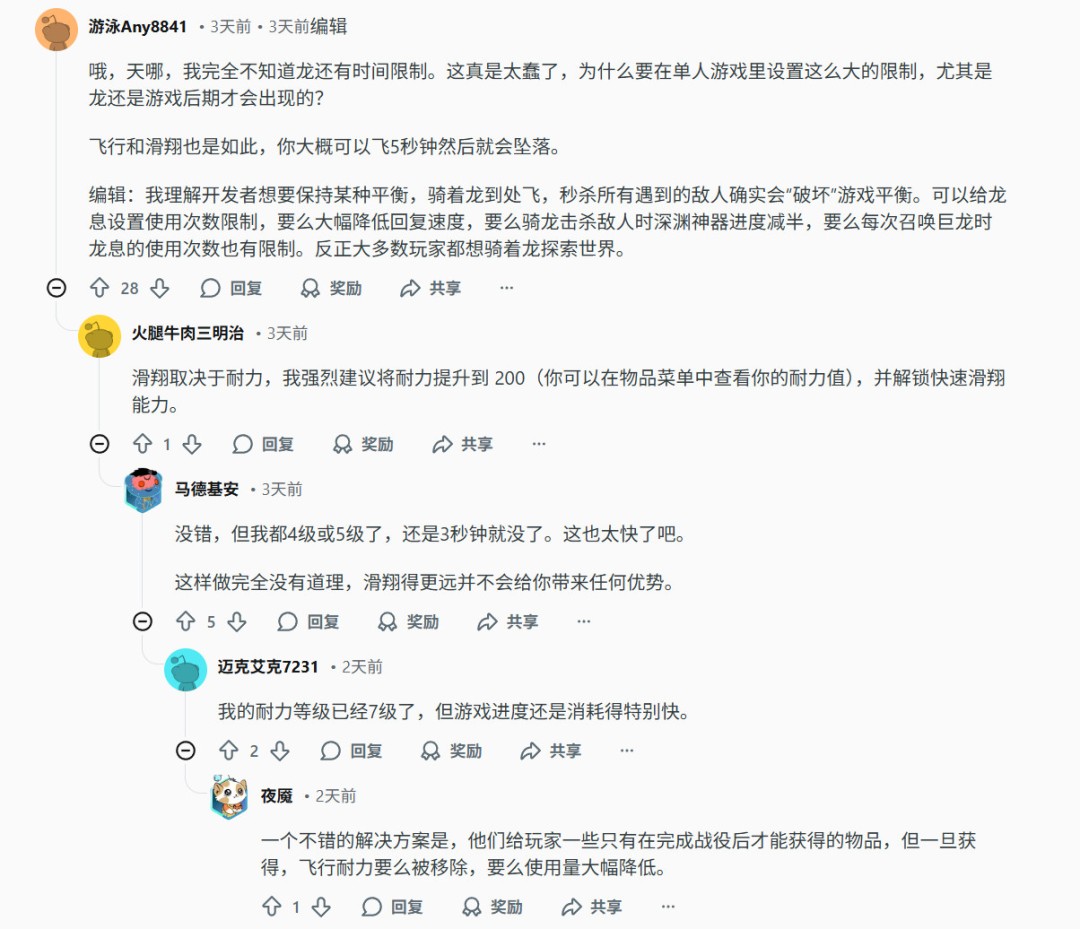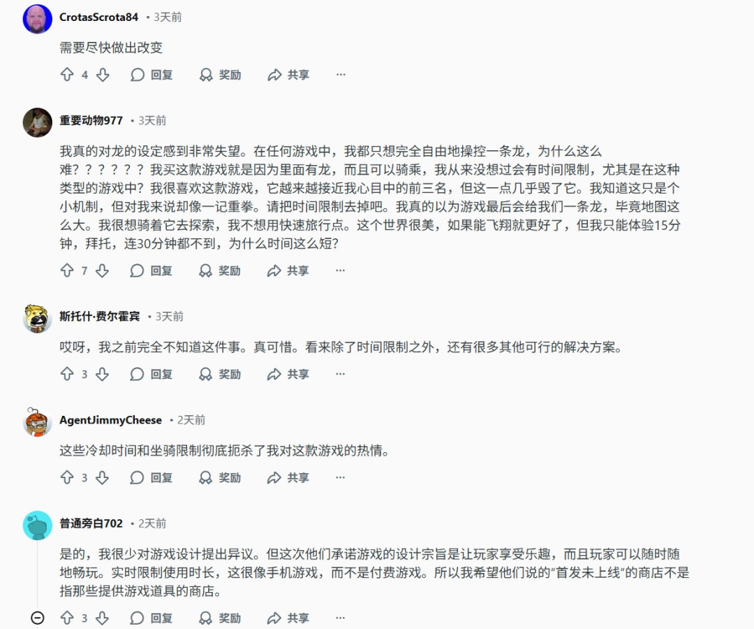 “我真的对龙的设定感到非常失望。在任何游戏中,我都只想完全自由地操控一条龙,为什么这么难??????我买这款游戏就是因为里面有龙,而且可以骑乘,我从来没想过会有时间限制,尤其是在这种类型的游戏中?我很喜欢这款游戏,它越来越接近我心目中的前三名,但这一点几乎毁了它。我知道这只是个小机制,但对我来说却像一记重拳。请把时间限制去掉吧。我真的以为游戏最后会给我们一条龙,毕竟地图这么大。我很想骑着它去探索,我不想用快速旅行点。这个世界很美,如果能飞翔就更好了,但我只能体验15分钟,拜托,连30分钟都不到,为什么时间这么短?”