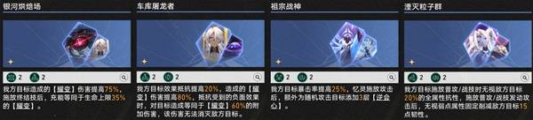 二星方程方面,【流星批发商】可为死龙提供稳定的真伤增益;【彗星调教师】可提供暴击伤害加成;【园艺师】可提供额外附伤;【星空寓言家】可提供易伤加成,【转职轮盘】可提升全队速度,并以此提升风堇治疗效率,加快队伍循环。