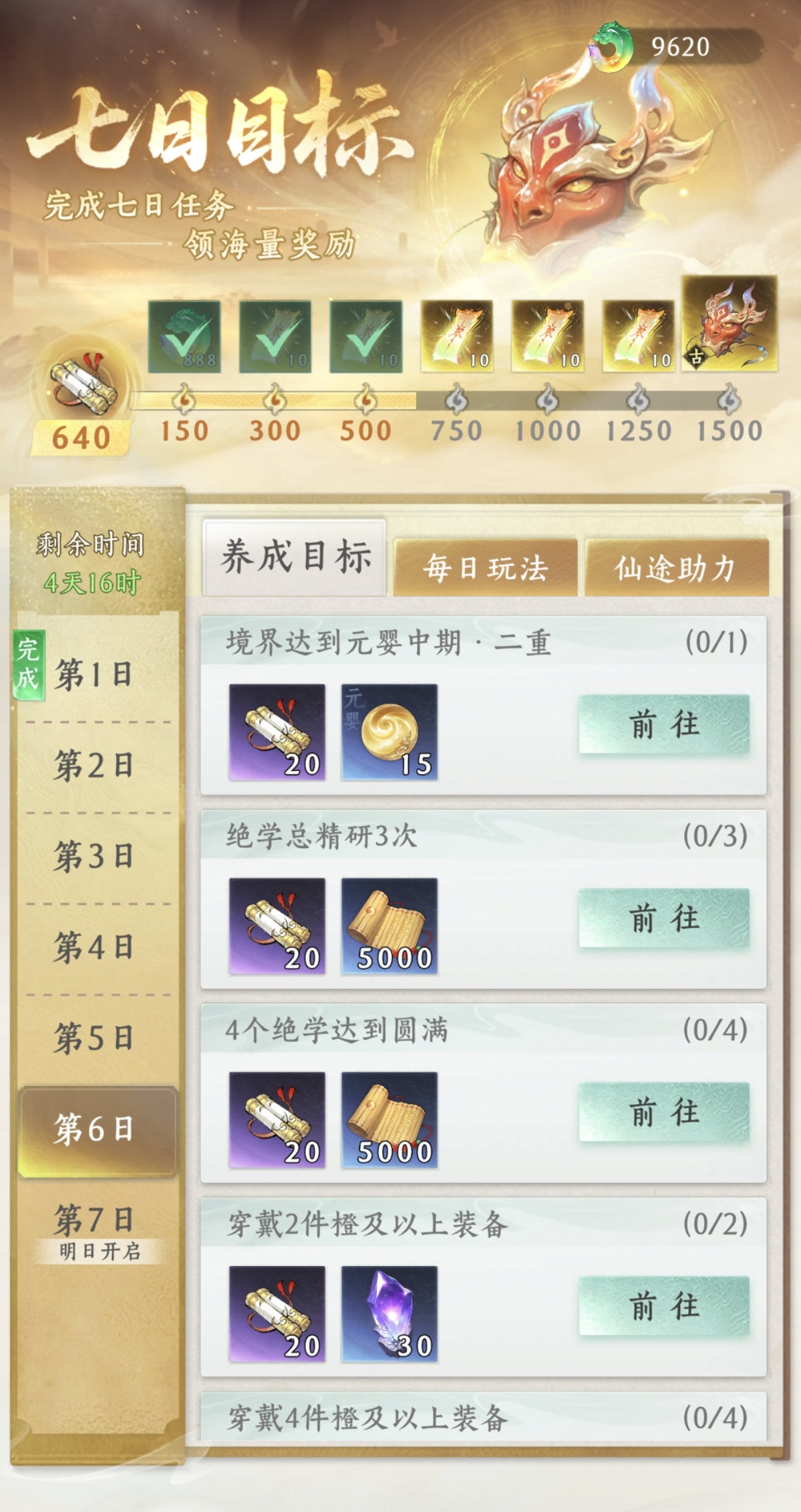 日常活跃体系为仙缘供给主干:完成悬赏任务、宗门巡山、灵脉采集等20项固定日常,累计满100活跃度后,即可领取100点仙缘;该奖励每日可领一次,长期坚持月均稳定增收超3000点。周常系统进一步加码,每周达成指定活跃阈值(如500/800/1000点),可分别领取50、100、50点仙缘,周满额总计200点,与日常形成互补闭环。