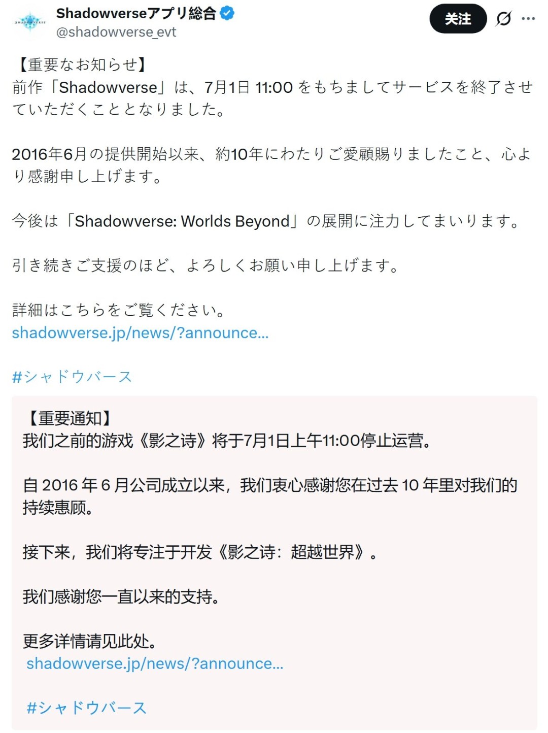 官方同时表示,在最后几个月的运营中,将举办一系列纪念活动,并邀请玩家在社交媒体上分享与《影之诗》的珍贵回忆。