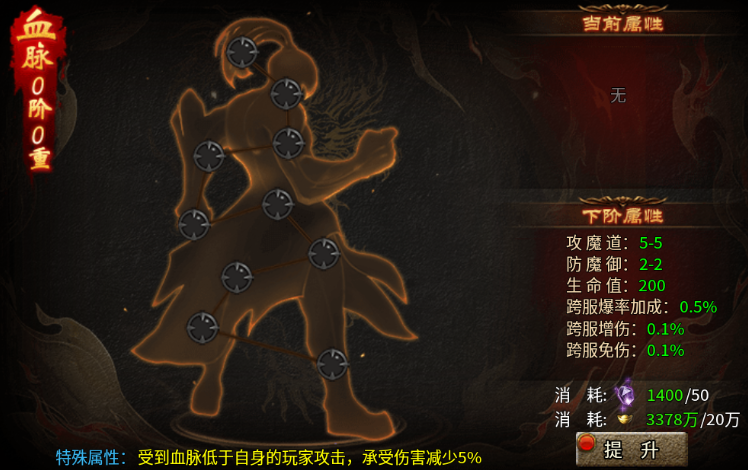 血脉系统是跨服PVP阶段的核心竞争力来源。该系统以紫灵石与元宝为培养资源,支持阶级突破与重级晋升双重成长维度。每次阶级提升不仅带来基础属性增益,更同步解锁跨服爆率、跨服增伤及跨服免伤等实战向加成。当参与跨服战斗时,若自身血脉阶级高于对手,可直接降低所受伤害5%,形成实质性压制优势。因此,中后期资源倾斜应向血脉系统重点倾斜。