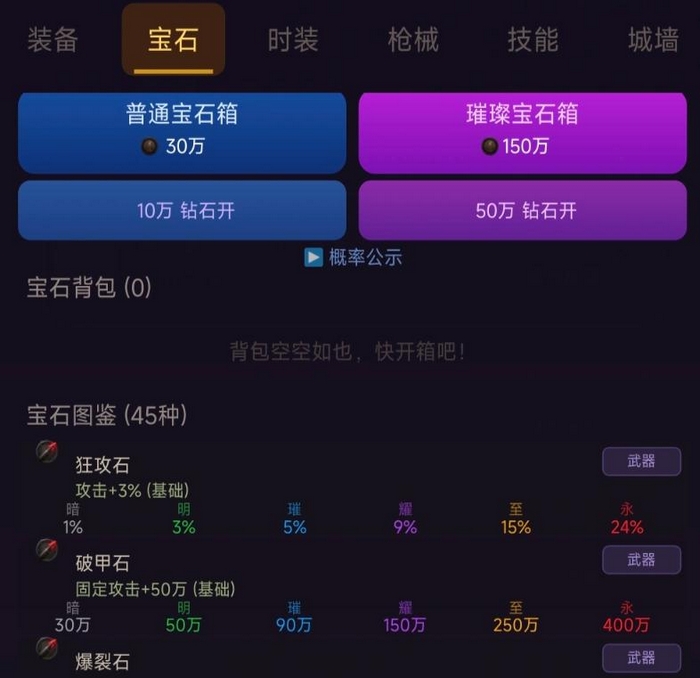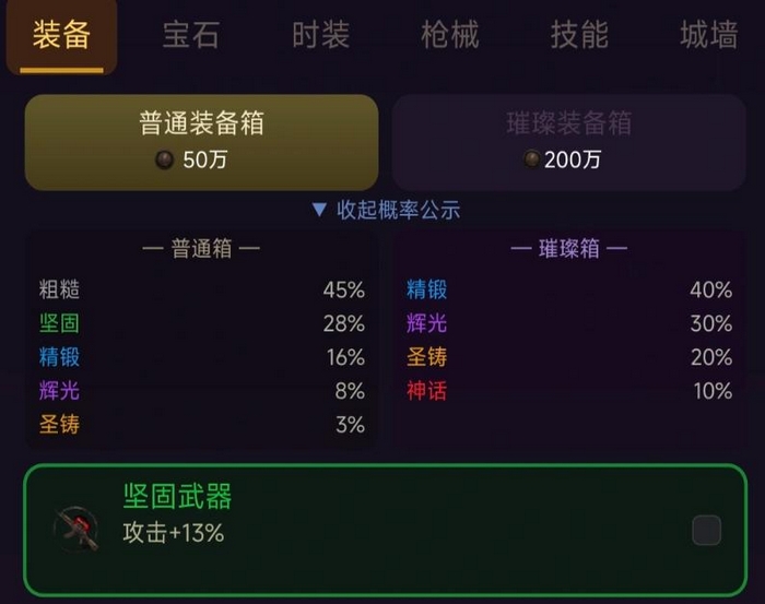 养成内容还挺丰富的,像是装备、宝石、时装、机械、技能、城墙等等,有好几条的养成线。装备和宝石都是需要开箱获取的,因此对金币的的需求还是蛮高的。养成初期提升很缓慢,但随着资源累计逐步加快,养成速度也会越来越快。