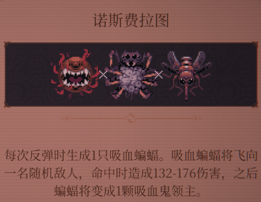 如果为他搭配吸血弹的话,那么大家要注意准备两枚,因为这样的话才可以解锁更多的进化条件,而战斗号角的话也是比较适合跟鞭挞者自身能力放在一起用的,这个词要可以提升它在迷你弹珠上面的效果,所以大家也要注意鞭笞者在自身弹珠投放上面路线是什么样的,完成整体的融合之后,后期的核心就通过他这样的弹珠投射保证足够的输出就可以了,那么在有足够输出强度时这里大家也可以为他搭配一个诺斯费拉图,这样在每次反弹的时候都可以生成一个吸血蝙蝠,吸血蝙蝠在地图当中可以飞向敌人时造成最高176点的伤害之后,会变成一个吸血鬼领主,所以如果大家玩儿鞭笞者的话,他后期走吸血鬼流派是非常适合的。