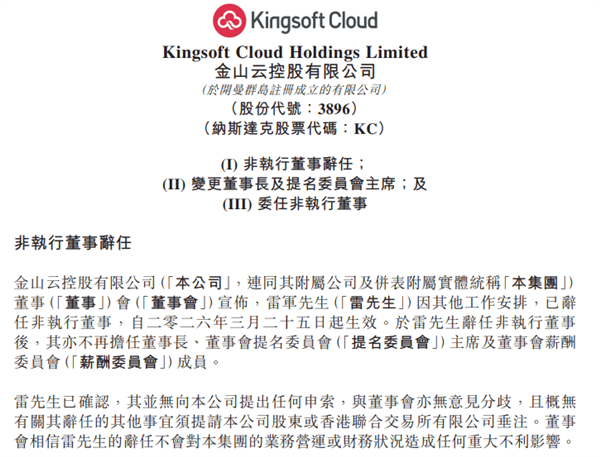 3月25日消息,金山云今晚在港交所发布公告,雷军因其他工作安排,辞任公司非执行董事、董事长及董事会提名委员会主席、薪酬委员会成员全部职务,即日起生效。