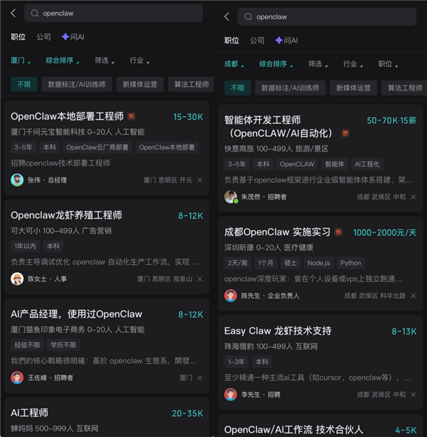 随便打开一个招聘网站一搜,你别说,你还真别说,「OpenClaw」标签下的在招岗位真是不少: