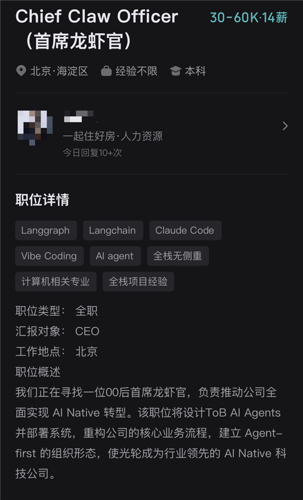 当你以为🦞还是大家伙业余养养的新鲜玩具,已经有公司正经在招「龙虾官」了。(doge)