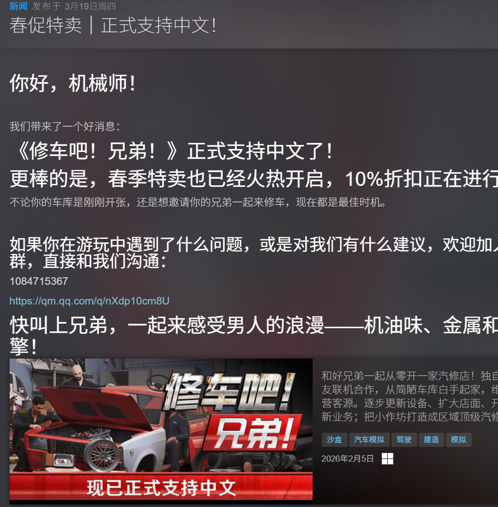 Steam特别好评独立游戏《修车吧!兄弟!》趁着春季特卖,最近更新了中文支持,现已支持简体中文和繁体中文。