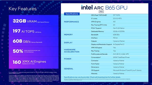 锐炫Pro B65采用精简版BMG-G31,20个Xe核心、160个XMX引擎,峰值算力197 TOPS,板卡功耗200W,同样保留32GB GDDR6显存。