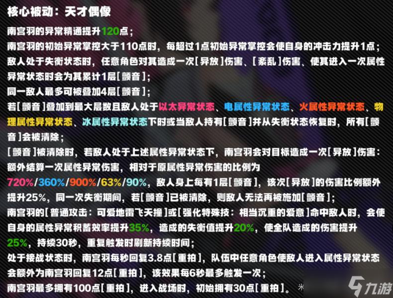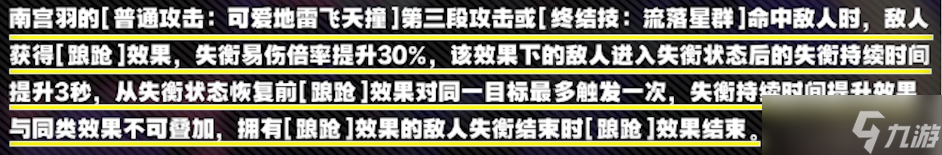南宫羽失衡值额外提升50%,增加了一个【颤音·改】机制,类似于非失衡期的【颤音】,敌人进入失衡后就会爆掉造成异放伤害,看着后面的【颤音·改】描述很多,但其实提升最大的是前面这个提升50%失衡值,失衡速度直接快了一半。