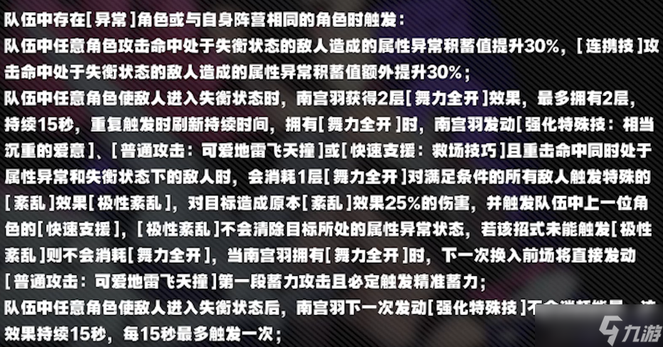 南宫羽的蓄力普攻、强特命中敌人时,使自身异常积蓄效率提高35%,失衡值提升20%,全队增伤25%。