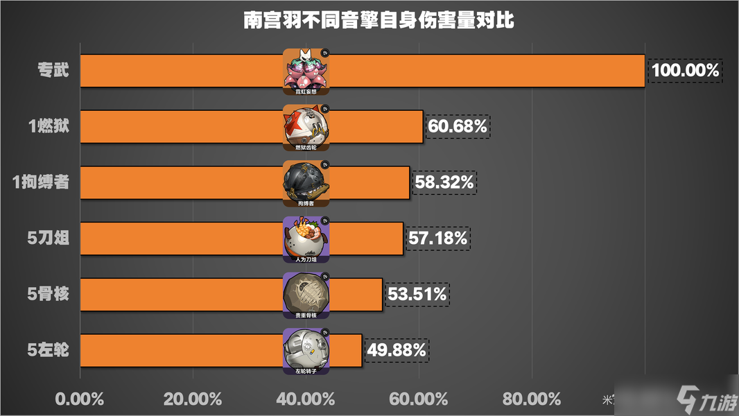 首先是不同音擎对南宫羽自身的伤害量影响,由于击破音擎只有专武加精通,其他就稍显劣势了;1阶燃狱60.68%;拘缚者58%;5阶刀俎57%;5阶骨核53.5%;5阶左轮49.88%。