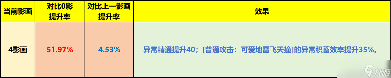 精通提升40,蓄力普攻的异常积蓄提升35%,纯提升南宫羽伤害的影画,更深入点说也可以多爆几次紊乱,但收益有限,由于南宫羽在爱芮配队中,伤害占比约为16%,也不算特别高,这个4影算到里面就更低了;4影伤害量是0影的152%;相较于3影,4影提升率为4.5%。
