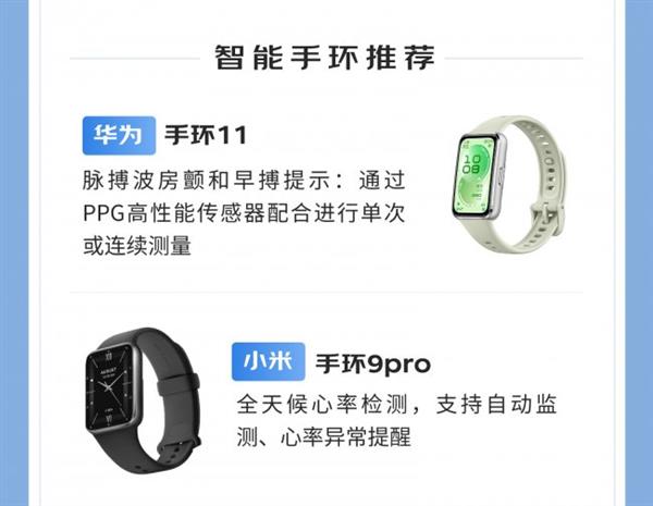 智能手环同样在健康监测领域持续进阶。华为手环11基于PPG高性能传感器,可实现房颤与早搏的单次或连续测量;小米手环9 Pro则支持全天候心率监测与异常提醒,为用户的日常运动与健康管理提供持续、稳定的支持。