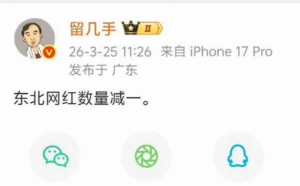 留几手此前在微博发文称“东北网红数量减一”,
