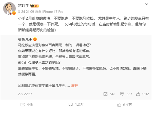 随后,留几手删除争议微博,仅保留提醒大家注意身体,不要随意跑马拉松的内容。
