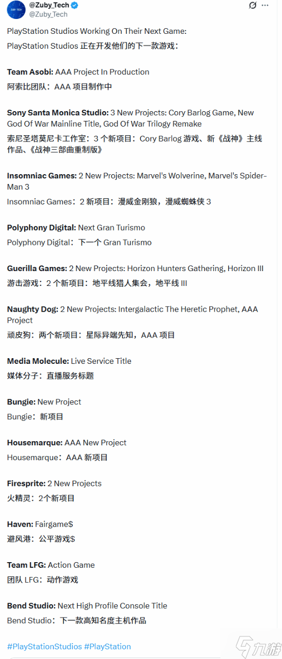近日,海外爆料账号@Zuby_Tech公布PlayStation Studios旗下各工作室的新作开发计划,按照索尼的惯例,这些传闻中的大作很可能和PS6世代同步,涵盖《战神》《地平线》《漫威蜘蛛侠》等经典IP续作与全新项目,引发玩家高度关注。