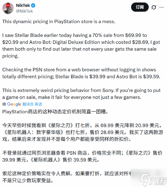“如果不登录账号直接从网页九游查看,价格会完全变样。”@NikTek指出,同样的《剑星》在网页端显示为39.99美元,而《宇宙机器人》则是39.59美元。这种“因人而异”的定价行为在社区引发了极大不满,玩家纷纷呼吁索尼应该给所有人公平的折扣。