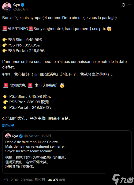 据法国情报人士Gyo透露,索尼将在欧洲地区把PS5基础版和Pro版主机的价格提高100欧元(折合人民币约797元)。