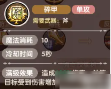 其实在后期2转之后,骑士也会根据不同的武器专精来走两个不同的方向,这里如果是斧分支的话,可以利用团队的效果带来核心能力,这里要用斧头分队的话,碎甲的技能就比较关键,这个技能可以在造成伤害的同时给目标带来一定的硬伤叠加,而且效果是可以进行共享的,所以团队的总输出可以利用这个分支来进行提升,如果走的是剑分支的话,那么这里就要注意放弃一部分的防御数值,才能够将自己的攻击提升到最好,能够打出不亚于其他输出职业的高频伤害效果。
