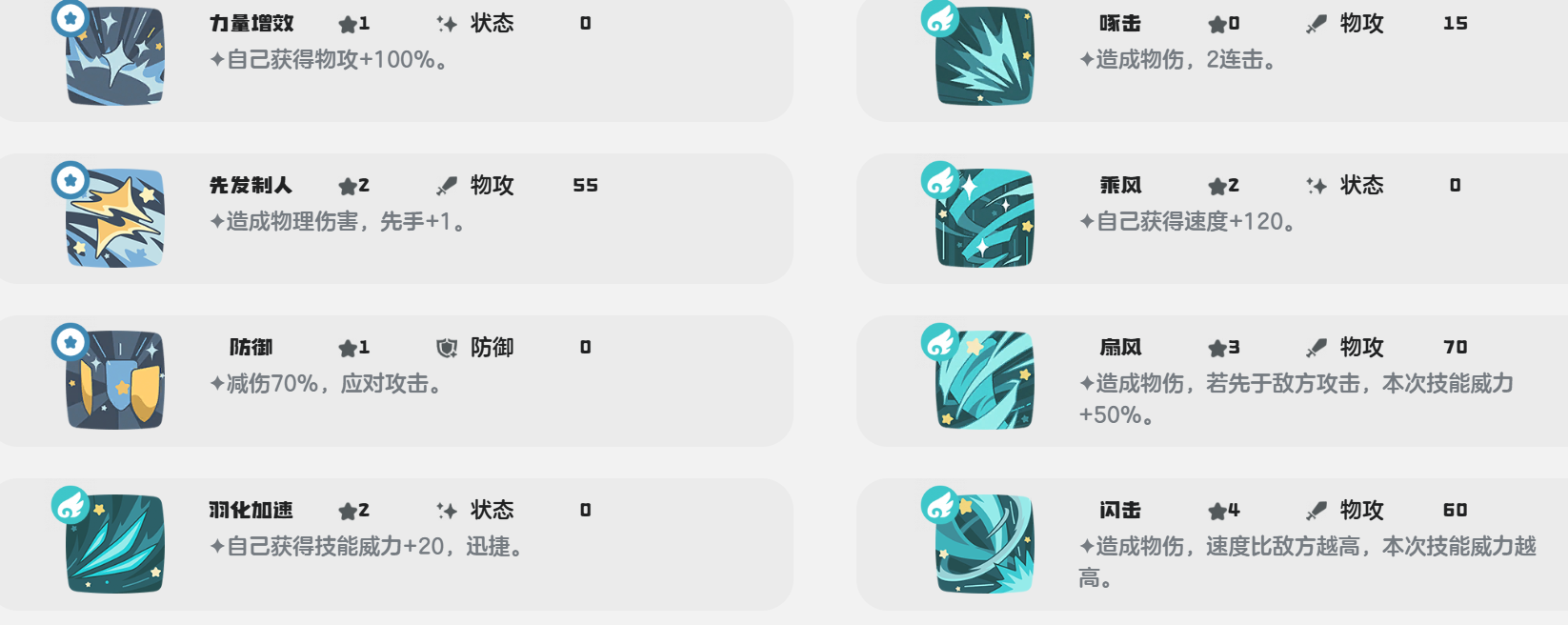 想要更好地运用冬羽雀,先要了解它的技能。突袭作为核心的爆发技能,一旦触发之后,特定的状态下,它的威力将会翻三倍,和顺风的特性正好适配。扇风物理攻击的威力是75,如果先手时额外就会增伤,双重增伤下输出直接就会达到最高。压扁物理攻击的威力是140,作为高额的单体伤害技能,该技能其实是专门用来收割残血或者是攻坚高血量的目标,乘风能够有效的提升自己的速度,牢牢的锁住先手权,这样的话就能够进一步将优势放大。