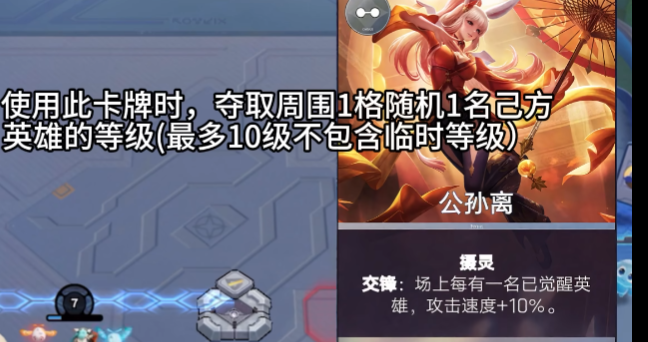 大家玩他的时候可以搭配上公孙离的摄灵,摄灵可以在使用这张卡牌的时候,夺取周围1格随机1名英雄的等级,这样集中等级,可以让公孙离自身快速升级帮助我们稳住血量,同时利用班叔的机关和场上站位,将其保护在后排区域就能拿下优势。