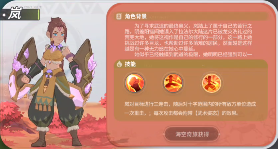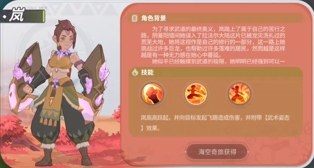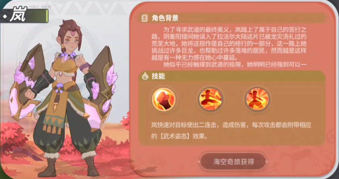 岚:让我来介绍一下我的技能吧,首先是【武术姿态】:所有攻击依次以武术姿态·破、武术姿态·劲,武术姿态·震,3种招式循环轮换施放并附带额外的效果:武术姿态·破:降低目标10%物理防御持续1s;武术姿态·劲:造成50%攻击力的额外物理伤害;武术姿态·震:降低25%速度幷有25%几率改为【晕眩】,持续0.5s。我的主技能会快速对目标使出二连击,造成伤害,每次攻击都会附带相应的【武术姿态】效果。