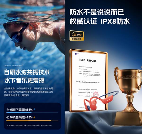 1. 游泳好拍档:IPX8 级防水与32G大容量存储,下水也能听HIFI