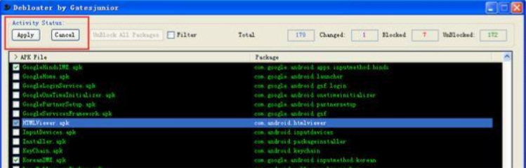 4、删除应用:勾选需要卸载的 APP,点击左上角的 Apply 按钮,即可完成卸载;冻结应用:选中列表里的 App,点击左上角的 Apply 按钮即可冻结预装 App,注意切勿冻结系统功能,否则可能导致设备无法正常使用。