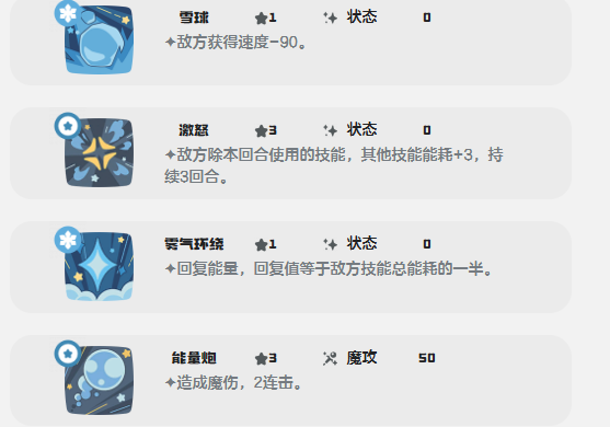 其技能组设计强调功能性与资源压制逻辑。“冰冻光线”不仅造成稳定的魔法伤害,更附带寒气效果,在输出同时持续抬高敌方技能能耗;“聒噪”则进一步加速敌方攻击类技能的消耗速率,逐步瓦解其作战节奏;最具策略张力的是“冰封横扫”——该技能基础威力等同于敌方当前累计技能总能耗的10倍。这意味着当敌方频繁使用技能导致能耗堆积时,此招可实现精准反制,虽无瞬杀能力,却能通过多层控制链牢牢掌握战场主动权,是团队中不可或缺的节奏调控者。