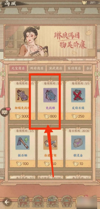 进入商城界面后,点击【免战牌】图标。