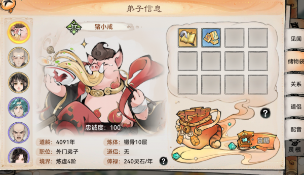 依次点击:弟子-见闻-储物袋,之后就可以看到弟子身上携带的东西了!