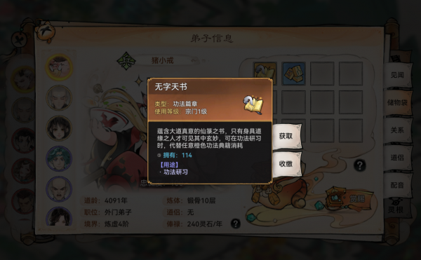 这时我们先点击想要的物品,再选择“索取”,就能以降低弟子的忠诚度为代价来获得它。(忠诚度掉一点无关紧要,会慢慢回复上来,但是不要掉太低,不然弟子不干活啦!)