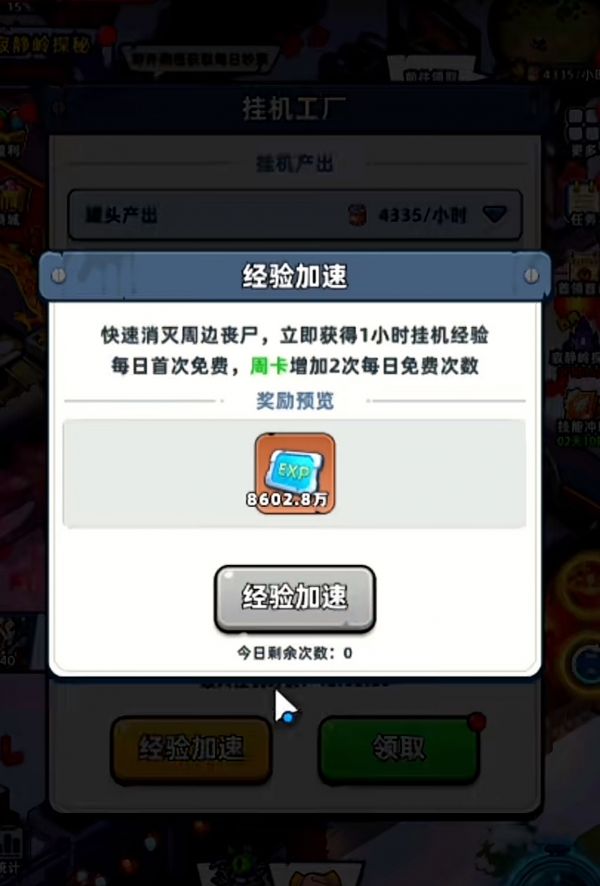 此外,购买周卡也可以让挂机的资源产出效率得到百分百的提升,是属于性价比比较高的投入回报。而且如果因为仓满导致无法继续获取资源的话,还可以利用“资源找回”的功能把已经生成但是还没有领取的资源找回,避免了产出资源浪费的情况,但需要消耗50到100钻石。另外,挂机工厂的升级是需要消耗一定的资源的,比如钢铁,木材等,所以大家要注意好资源分配,在确保存活物资充足的情况,可以优先升级工厂。